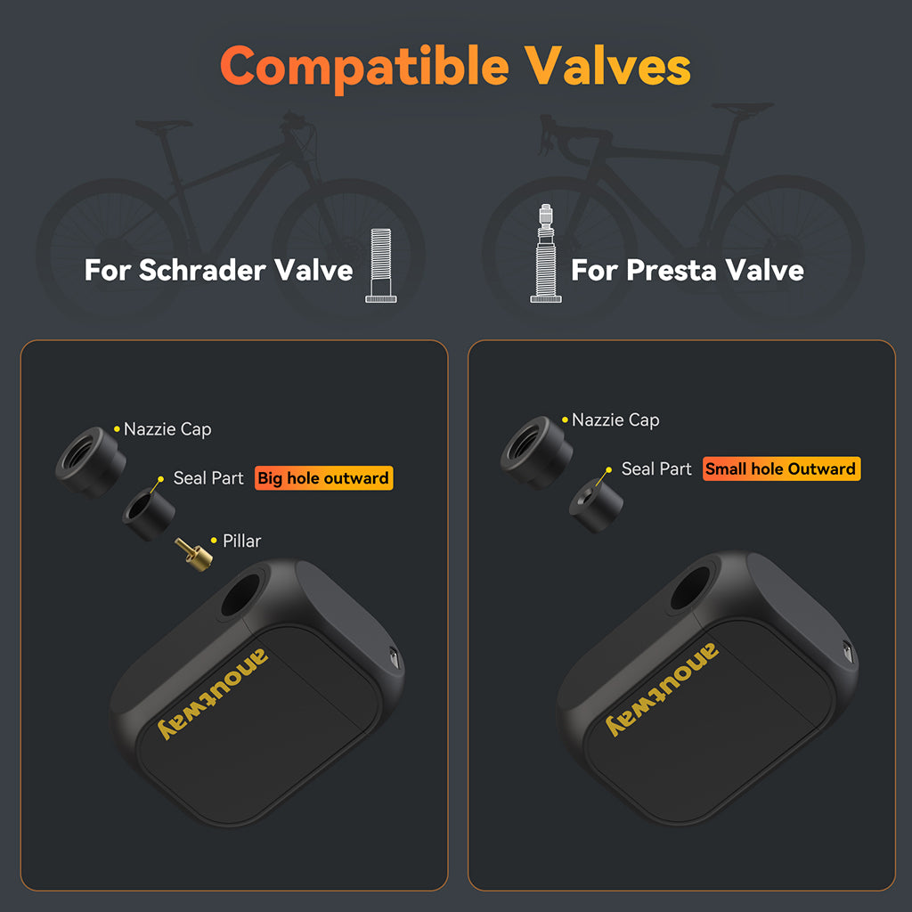 - The unique nozzle design of AS210 Pro allows for effortless switching between Presta and Schrader valves without the need for extra accessories.